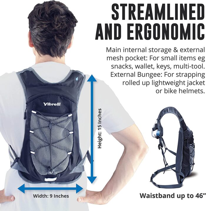 • Multiple Storage Options: Vibrelli’s hydration backpack design has intelligent storage options and pockets without being bulky